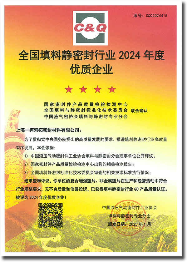 上海一柯索拓密封材料有限公司榮膺"全國(guó)填料靜密封行業(yè)2024年度優(yōu)質(zhì)企業(yè)"稱號(hào),以創(chuàng)新密封技術(shù)驅(qū)動(dòng)產(chǎn)業(yè)未來。